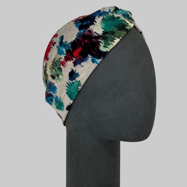 Twist Knot Stirnband in Beige mit abstraktem Muster.